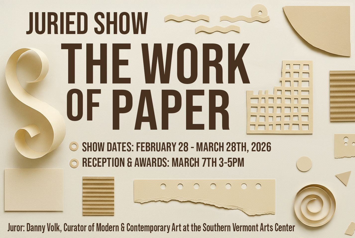 The Work of Paper Juried Show 2026 Curator: Danny Volk, SVAC Show Dates: February 28 - March 28th, 2026 Reception and Awards: March 7th Edgewater Gallery at the Falls 1 Mill Street, Middlebury Paper is
